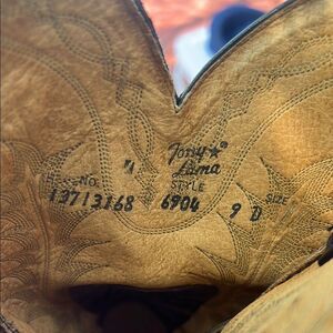 These stylish Tony Lama western boots are a must-have for any cowboy or boot enthusiast. Crafted from high-quality leather, these boots are built to last and provide the perfect combination of style and comfort. With a sleek black color and classic western design, these boots are sure to make a statement wherever you go.Featuring a 9 D US shoe size and a D width, these boots are the perfect fit for any man. The outsole and upper material are both made from leather, ensuring durability and breathability. Whether you're riding the range or just looking for a stylish pair of boots, these Tony Lama boots are the perfect choice.