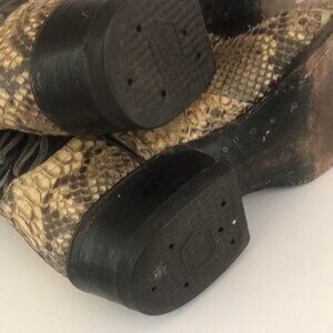 Materials: Genuine snakeskin vamp and heel counter; leather shaft with contrast embroidery; leather lining; leather soles with rubber heel caps