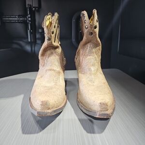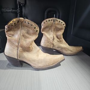 Tony Lama Brass Studded Sparkling Snip Toe Short Cowboy Boot Women's 9.5 Great PreOwned Condition. Very Rustic & Western Looking With The Rough Distressed Leather, Brass Studded Shaft, Dark Brown Stacked Heel. They Are Side Zip Closure. The Uppers Are In Beautiful Condition. You don't Have To Worry About Scratches or Scuffs. Interior Lining Is Ing Good Condition With No Tears. The Soles Show Medium Wear. Approximate 2.5" Heels & 9.25" Overall Height.