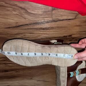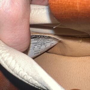 The pull on tab is loose on the left shoe. Light wear on soles. Otherwise Excellent Used Condition. No, rips, tears, or stains.