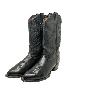Black leather Western boots by Tony Lama, perfect for adding a touch of classic cowboy style to your wardrobe. Designed for comfort and durability, these boots are ideal for everyday wear or special occasions.
