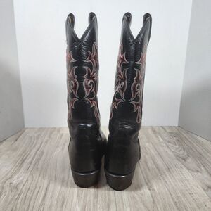 The Tony Lama Centennial Cowboy Boots are a tribute to the brand's 100th anniversary, featuring a classic mid-calf style with a pointed toe and pull-on closure for easy wear. Made with high-quality leather, these men's boots are adorned with intricate embroidered accents, embodying the Western cowboy theme. The black color and sturdy leather outsole make them suitable for casual occasions during the summer, fall, and spring seasons. Proudly manufactured in the United States, these boots are a stylish and durable addition to any man's wardrobe.