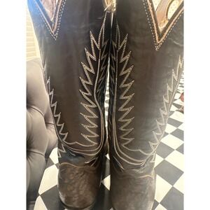 Step into rugged sophistication with these Tony Lama cowboy boots, a distinctive pair embodying timeless Western charm. Exotic brown snake print on the foot contrasts beautifully with the dark brown shaft, creating a visually striking design. Intricate stitching adorns the shaft, adding a touch of artisanal flair, while the classic cowboy silhouette exudes confidence and heritage. Imagine the feel of genuine, quality construction supporting every step as you walk with purpose and style. These boots aren't just footwear; they're a statement. Perfect for a casual weekend adventure, a night out at a country bar, or adding a touch of Western flair to your everyday attire.