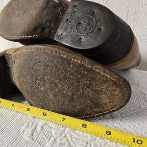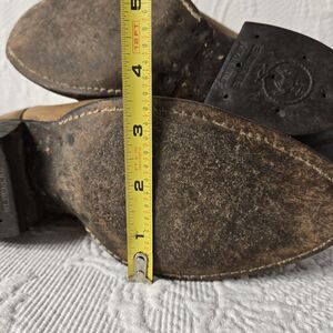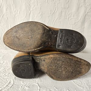 Tony Lama El Paso Texas x Biltrite Neoprene vintage leather cowboy boots. Men's 5 or women 7. Features Mid calf height, pointed toe, single role top stitching around trim, leather soles with wood trim, flame embroidery design in a orange and yellow patten, 100% leather, Pull up tabs on the both sides, and decorative embroidery on the top front. 1 1/2" heel and stamp branding in the bottom soles. Wear throughout, Brown color blocking with crown silhouette in the front.