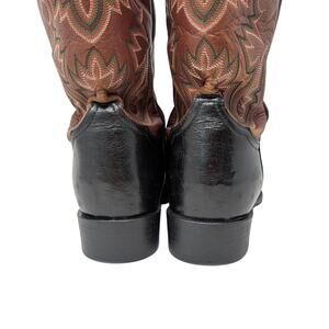 Vintage Tony Lama cowboy boots in full quill ostrich leather. Black and brown tones with tooled leather shafts and classic almond toes. Men's 9 EE. Made in the USA. Light creasing and sole wear.