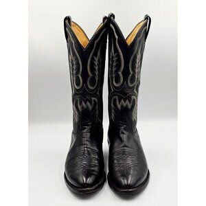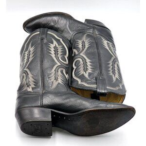 These Tony Lama boots are a quintessential embodiment of rugged elegance, featuring intricate embroidery against a backdrop of polished black leather. Designed in a classic Western style, they provide both aesthetic appeal and practical functionality. Their medium width and comfortable fit make them suitable for various activities, from a casual day out to a night on the town.