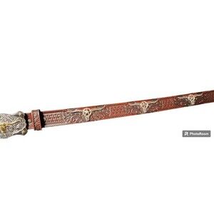 Add a touch of western style to your little one's outfit with this Tony Lama TEXAS Longhorn Tooled Leather Belt. The belt is made of high-quality leather and features studded, medallion, and buckle accents that give it a unique look. It has a normal belt width and fits a 25-inch waist, making it perfect for unisex kids in the United States. The brown belt is designed with a western theme and is perfect for any occasion. Whether your little one is going to a rodeo or just wants to add some flair to their outfit, this belt is sure to impress. It is also a great gift for any young fashionista.