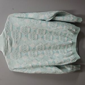 V-neck vintage sweater by Tony Lambert Features a textured geometic pattern in aqua and ivory