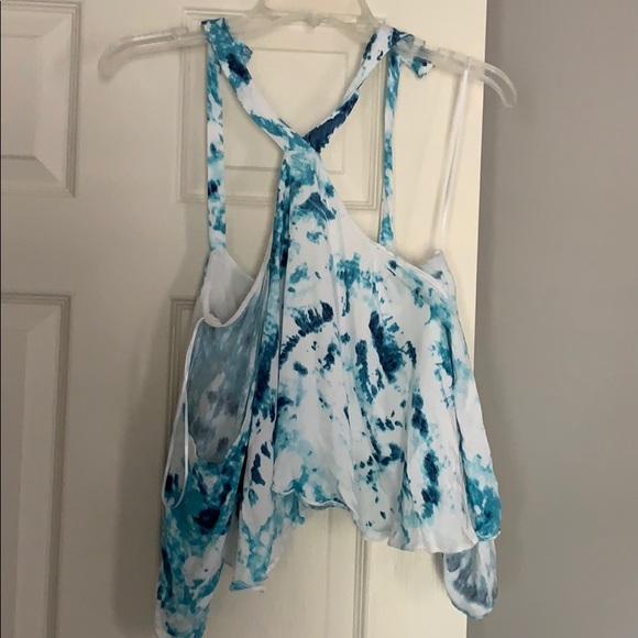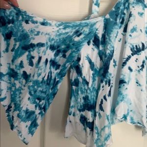 Blue & white top fastens behind neck with off the shoulder sleeves