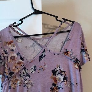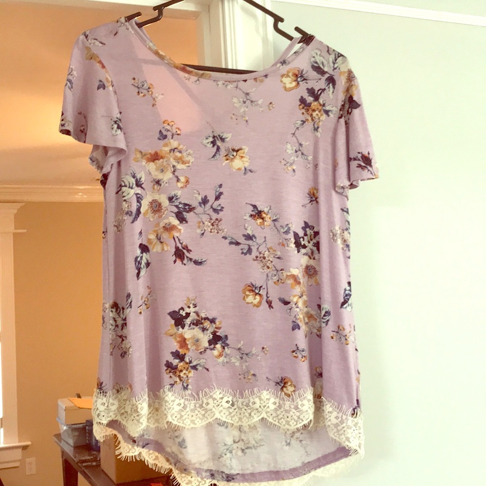 Lovely flower shirt with lace detail on the bottom. Also pretty detail on the back. Tags are off but never worn.