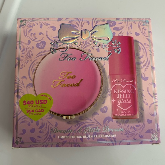 “Dream a Little Dream” limited edition set includes a full size blurring blush in “cloud crush,” and a full size kissing jelly lip oil gloss in “pink sherbet.”