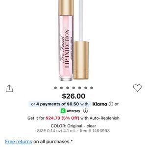Indulge in the luxurious feel of Too Faced's Lip Balm & Gloss, featuring a captivating blend of pink and gold hues. This product not only adds a touch of color but also nourishes and hydrates your lips, leaving them soft and supple. Perfect for a subtle shine and a hint of glamour in your everyday look.