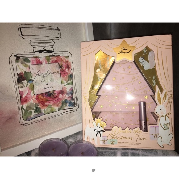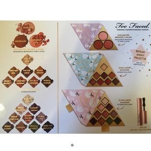 Brand new 3 piece set from too faced. Comes with 2 shadow pallets and 1 blush/bronze pallet. Also included is a mini better than sex mascara