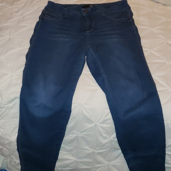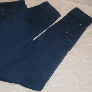 Stretch, straight legged, dark denim with bleach splatter on back of left leg. Can be covered up with boots.