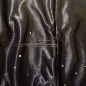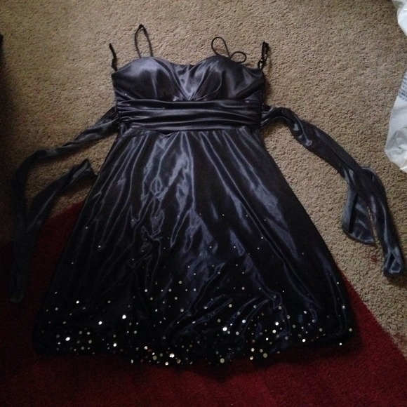 Beautiful black cocktail dress embroidered with flat shiny dots, with a grey sash. small runs in back