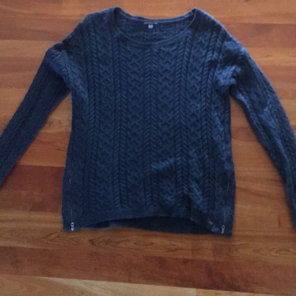 A blue sweater with zippers in the front