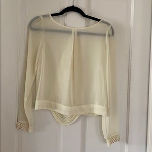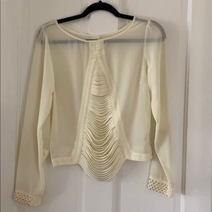 Sheer blouse with gold studded arm cuffs. Fringe back. Perfect for night out/date night.