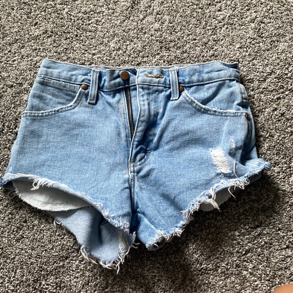 Wrangler jean shorts. Used. I think they are a 25 but I think they run small. I am a small or 2 in other shorts.