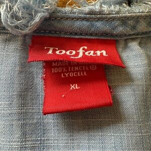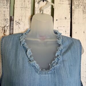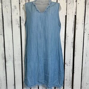 Toofan Chambray Dress Frayed Trim Pockets XL Blue Sleeveless Easy Wear Vintage Boho Classic Western Shift Cottage