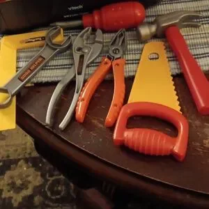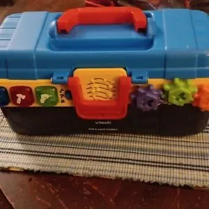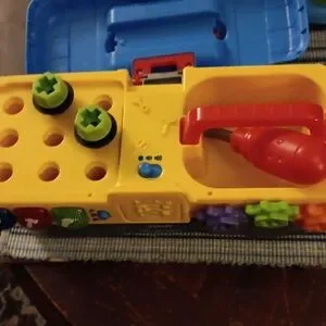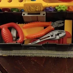 Toolbox includes a fix-it tray, hammer, pliers, needle nose pliers, wrench, ruler, screwdriver, saw, nails, and screws.
