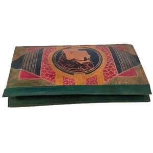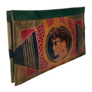 Large Vintage Tooled Embossed Leather Handbag Clutch with a Ladies Face/Head wearing Sunglasses. 100% genuine leather, made in India. No rips, cuts, holes. Edges intact, no wear. Interior is clean, no stains. This is a vintage bag so not perfect, please enlarge pictures for more detail.