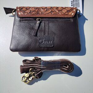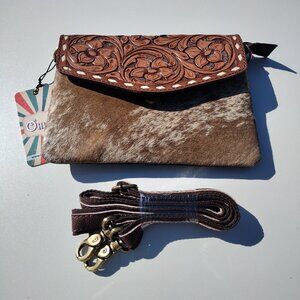 Tooled handbag cattle hair nwt NEVER used with long strap can be used as a cross body