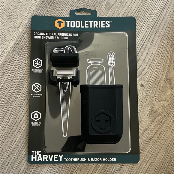Black Tooletries toothbrush and razor holder set. Perfect for organizing your shower essentials.