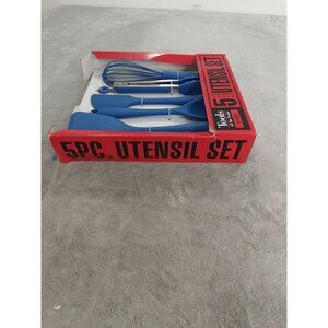 The Tools of the Trade 5-Piece Blue Silicone Kitchen Utensil Set is a new in box set that includes a cooking spoon, spatula, and tongs. Made of durable nylon and silicone materials, these utensils are heat resistant and perfect for various cooking tasks. The set features a silicone handle for easy grip and comfort while cooking. The set is branded as Tools of the Trade and is designed with a theme of tools, making it a practical and stylish addition to any kitchen.