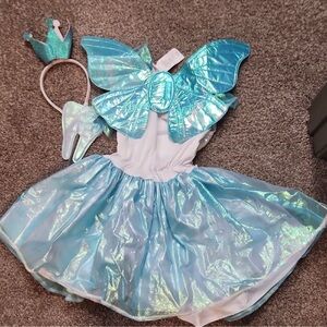 Iridescent blue tooth fairy costume with wings, wand, and headband. Ideal for Halloween and dress-up. Target size small