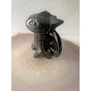 This is absolutely adorable! Carved Toothless Dragon in Black Obsidian. He stands about 2 1/4 inches tall and is about 1.85 inches wide. Carving has a matte finish.