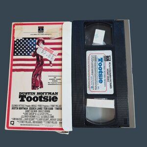 Classic 1983 VHS release of "Tootsie," starring Dustin Hoffman. Directed by Sydney Pollack, this comedy highlights a man posing as a woman to secure work. RCA Columbia print.