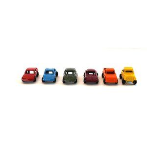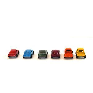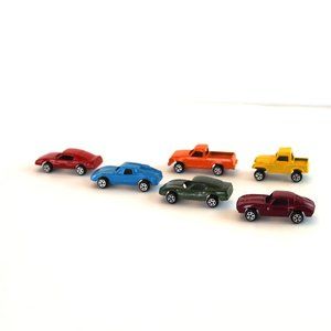 This lot includes 6 small, metal diecast toy vehicles: 4 sports cars, 1 pickup truck and 1 jeep.