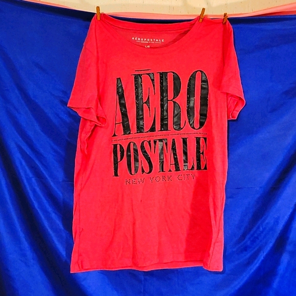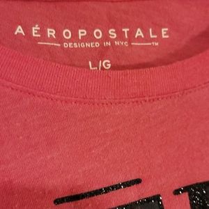 Bright pink top with Aeropostale in black. Pre-Loved L small hole on front(last pic).