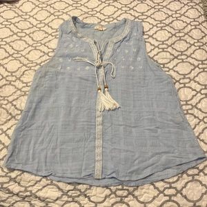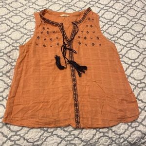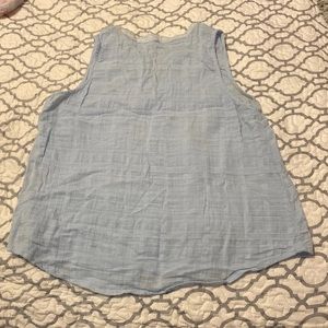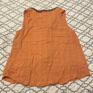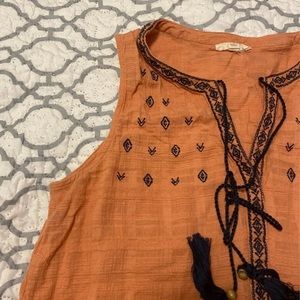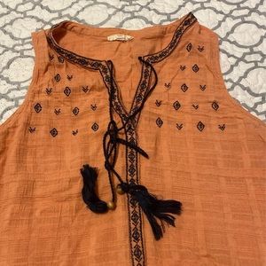 Orange& Light Blue sleeveless top V neck Has a self tie Very light The orange is Medium The light blue is Large The material is a linen feel