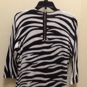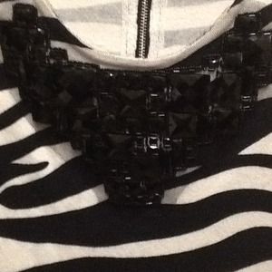 Black and white zebra top; exposed black zipper in back. Black bib detail at color