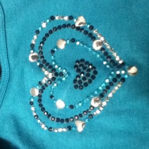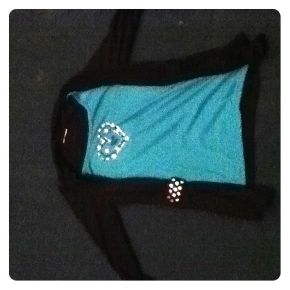 Teal shirt with built in cardigan with a rhinestone heart on the chest