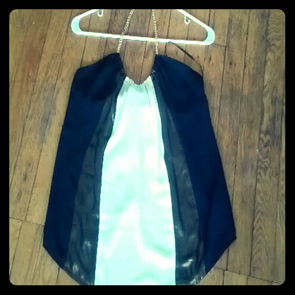 Great top for going out! It is a halter top with a chain around the neckline, creme, black, & gold with a tie in the black leaving an open slit. Before for a night out or a summer day! Wore once like new!