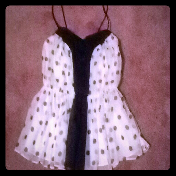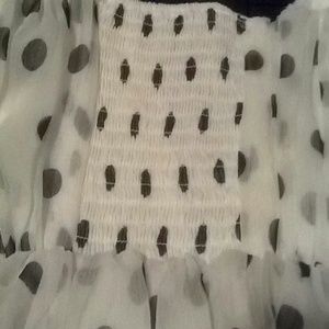 Spaghetti strap tank top. White base, with Navy blue polka dots. Lining is made with cotton and the shell is made with polyester. The back of the tank is gathered, with a scrunch look. Zipper is on the side. Wore once, like new!