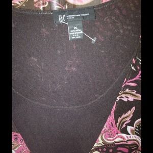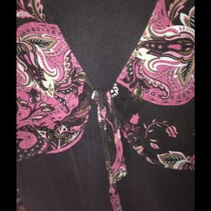 Two piece look with one piece. Ties up in front tag says 2x but does not fit as one more like XL