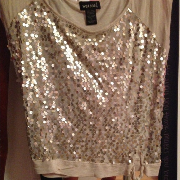 Cream colored top with sequins. Strings at the bottoms to tie in a bow. Great condition.