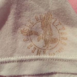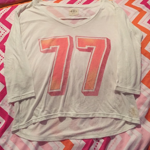 This is an American eagle top that is super soft. It is white. And it has and orange 77 on it.