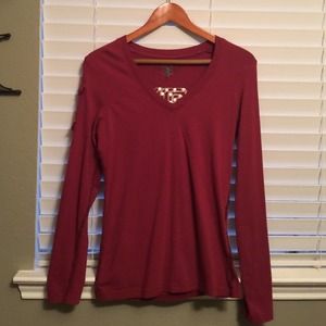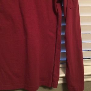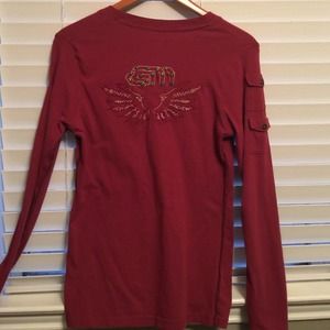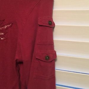 Cute top, too small for me now but has a cute design on back with studs and stitching. Two small pockets on sleeve and shirt looks like it's turned inside out , but that is the style of shirt.