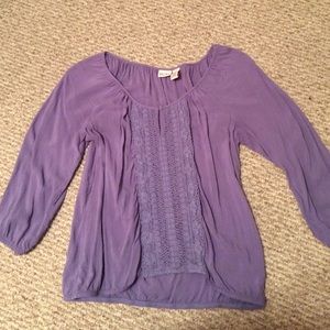 Purple 3/4 sleeve top with lace down the middle on the front. Sinches at the bottom. Size large from Mudd brand in juniors section at Kohls.