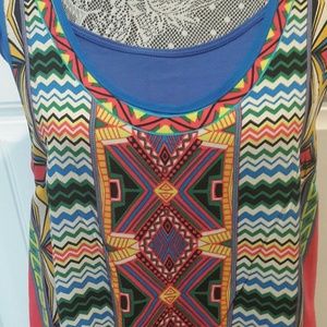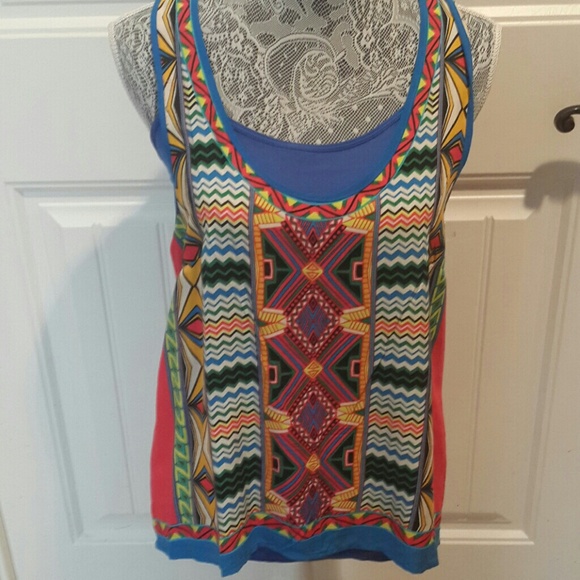 Multi colored tank with t-back. Paired with royal blue cami tank. Sold seperately.