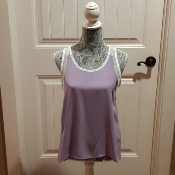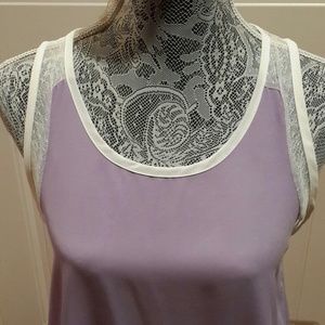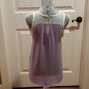 Lavender high low top with lace detail on the shoulders and upper back