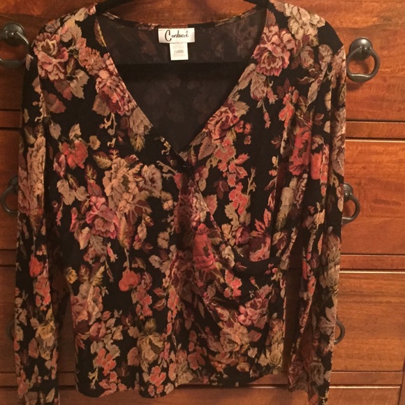 Dressy top that over lays on the chest, gathering at the hip. Beautiful with a pants suit or with a pair of slacks