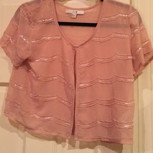 Cropped, sheer blush colored top. Hook and eye closure. Subtle sequin pattern. Can be worn over a tank. Great piece for all year.