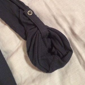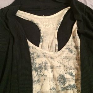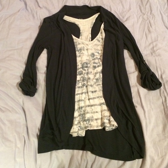 Dark blue cardigan with a design tank top. Very lite comfortable. Great for any season.