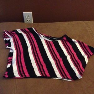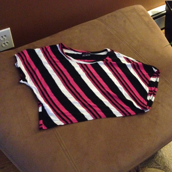 Youth girls striped top. Pink white and black. Can be worn with a black tank top under it. Wider sleeves for loose fit. Crop top slanted point on one side of shirt. Very stylish and comfy. My daughter loved this shirt.... Excellent condition