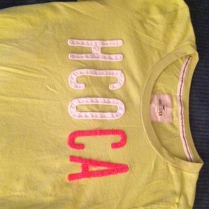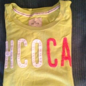 . Brand-new never been worn, lime green white and hot pink Hollister T-shirt. My lighting is not doing it justice! it is very lime green and super cute for a new shirt to go back to school in;)